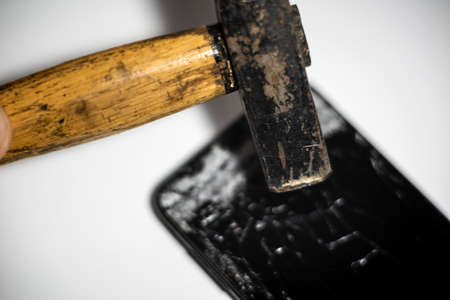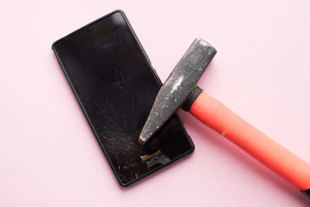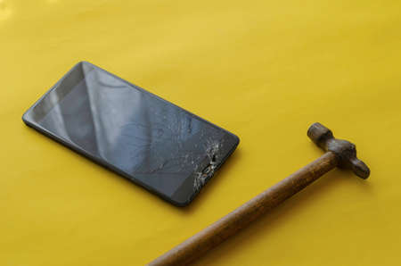 Hammer and smart phone with a broken screen.Electronics repair service. Crash smartphone.Indoors shot.