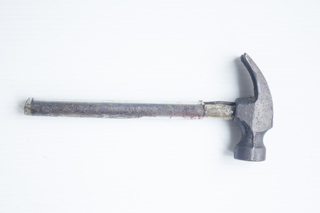 A used and worn european style hammer with a wooden handle and metal tip. Isolated on white reflective board.