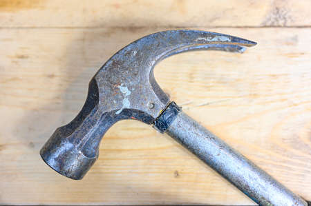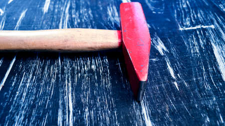 Hammer to repair lying on a wooden table. Mens housework. Worki