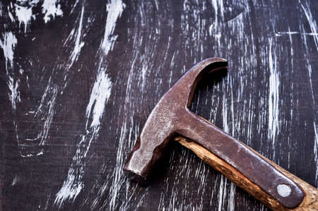 Old vintage hammer on a wooden table in front of a dark toned misty background. Selective focus.