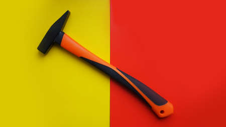 Hammer tool isolated on yellow and red background with copy space. Construction concept background.