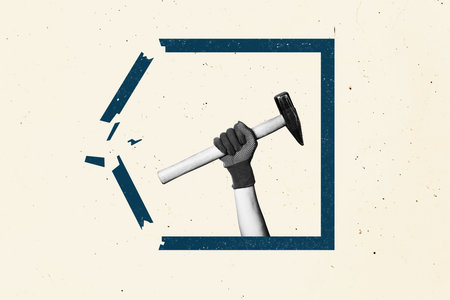 Creative composite sketch design artwork collage of hand wear glove hold hammer attack broken wall builder industry contractor handyman