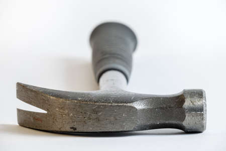 Hammer with a claw and black rubber handle. Lying on a white background.