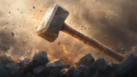 A hammer is shown in the air, with a pile of rubble below it. Concept of destruction and chaos, as the hammer strikes the pile of rubble, causing it to scatter and fall apart. The scene is dramatic with Generative AI