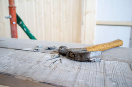 Hammer and nails lie on the scaffolding, against the background of a wall made of wooden slats. Work process. Home renovation.