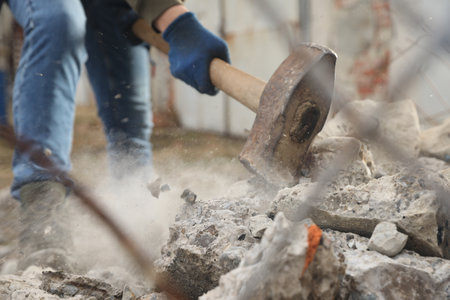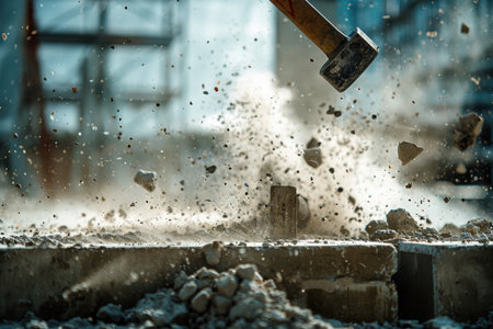 A high-energy scene depicting a hammer striking rock, creating dust and debris. This image captures the essence of manual labor in a rugged construction environment.