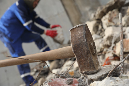 Working gloves with big hammer over ruins.