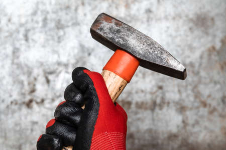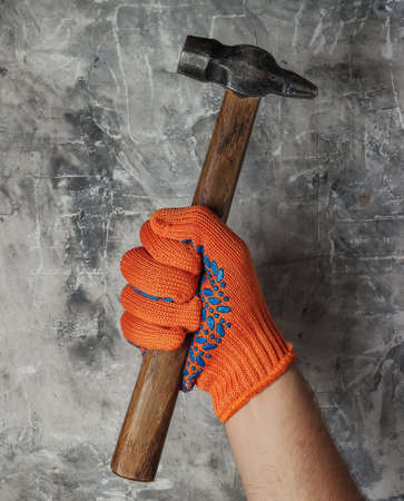 Hands with work gloves are holding a hammer on gray concrete background. Industrial worker
