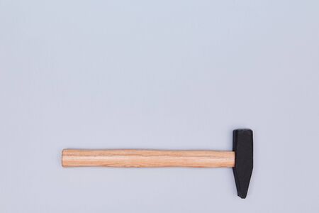 Carpenters hammer tool with wooden handle. Construction and renovation concept. Copy space. Isolated on blue background