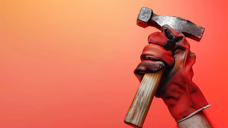 A Hand in a Protective Glove Grips a Hammer Against a Bold Red Background, Symbolizing Labor Day and Home Renovation