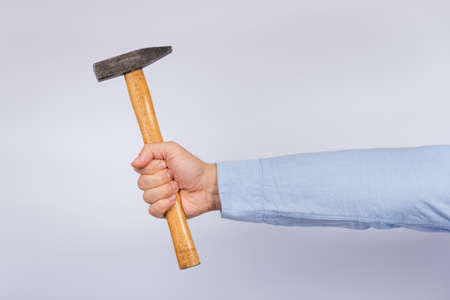 Middle section of a man holding an old hammer. Obsolete hand tool in the hands of a man. Metal nail hammer. close-up. selective focus.
