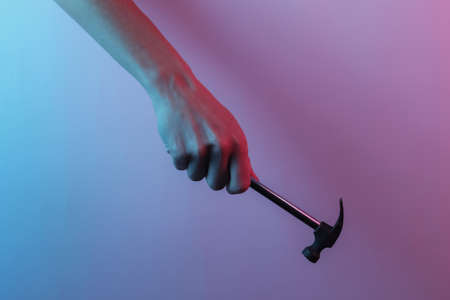 Hand holds a hammer. Creative pop art pink blue neon color. Trendy gradient illumination. Night light