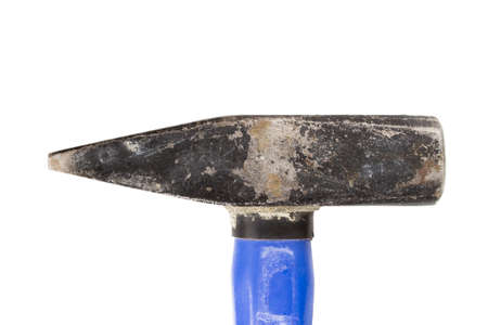 Old hammer with blue handle closeup isolated over white background