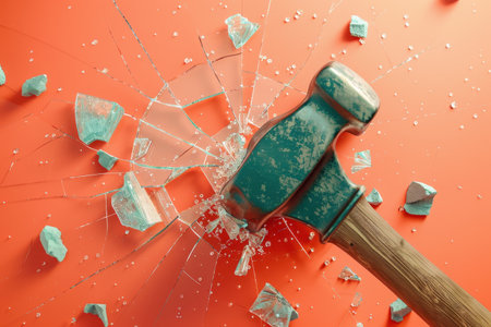 A hammer is on top of a pile of broken glass. Concept of destruction and chaos with Generative AI