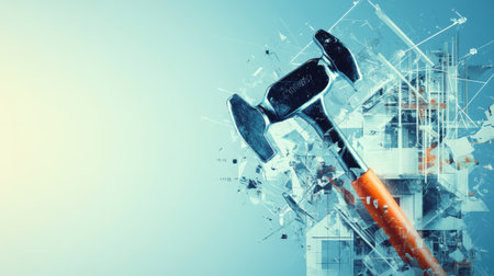 A striking visual shows a hammer penetrating a fragmented, modern construction site, symbolizing the power and impact of construction. The scene captures innovation and strength.