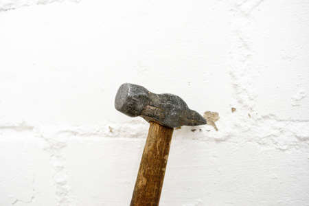 Hammer with a wooden handle against the white brick wall. Renovation in the house. High quality photo