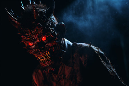 Devil with scary mask surrounded by red smoke. Halloween and horror concept