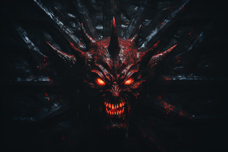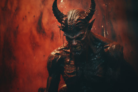 Digital illustration of a demonic figure, highlighted by a furious expression and dramatic red lighting. The creature is set against a cracked, dark background, evoking a feeling of intense rage and evil.
