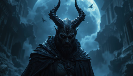 Malevolent figure in dark attire, standing before a gloomy moonlit backdrop of crumbling ancient structures.