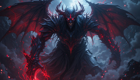 Large, imposing, demonic figure with large dark wings and glowing red armor, set against a dramatic night sky with clouds.