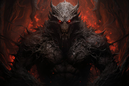 the demon, engulfed in flames, stands tall in the depths of hell, its full body a testament to its malevolent power, with razor-sharp horns, glowing red eyes, and massive wings spread wide, exuding an aura of terror and darkness in this eerie underworld scene. ai generated