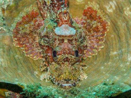 Predator fish - green devil scorpionfish (Scorpaenopsis diabolus) on the coral reef. Animal and corals, underwater photography from snorkeling. Tropical ocean and marine life.