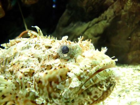 A stonefish (Synanceia verrucosa) laying in the gravel in marine aquarium