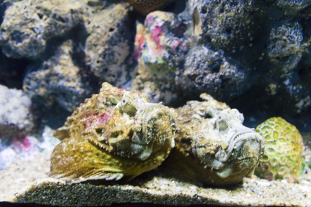 Black Stonefish by coral reef in aquarium. Black synanceia verrucosa fish