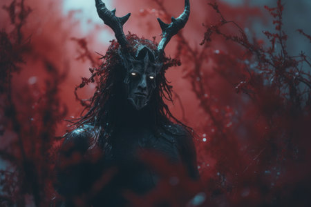 a man in a full costume and mask, adorned with horns, stands amidst a dark and foreboding landscape. the image captures the essence of deathcore with its subtle tonal values and necropunk aesthetic. inspired by norwegian nature, the contrasting dark black and light beige colors add to the overall mysterious and captivating atmosphere. ai generated
