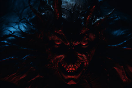Intense closeup of a demon with detailed red skin texture, imparting a sense of horror