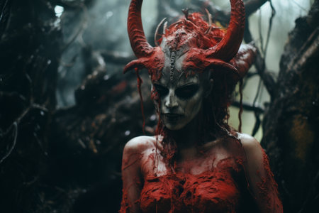 A Sinister Red Demon With Elaborate Horns and Intricate Body Art in an Enigmatic Setting.
