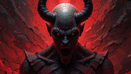 Digital illustration of a demonic figure, highlighted by a furious expression and dramatic red lighting. The creature is set against a cracked, dark background, evoking a feeling of intense rage and evil.