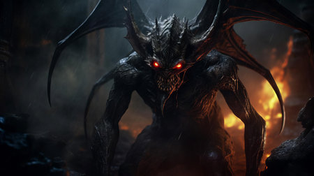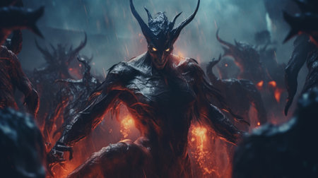 devil, surrounded by fiery flames of hell, casting his evil eye upon mortal souls, created with generative ai