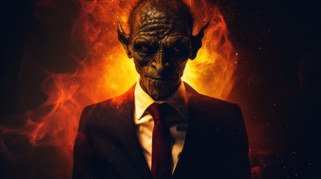 a suit is displayed against a fiery backdrop, resembling a demonic photograph. this social media portrait showcases character caricatures and goblin academia. the subject's strong facial expression adds to the intensity of the image, while the dark gold and red tones create a captivating atmosphere. this unique photo embodies the essence of frogcore aesthetics. ai generated