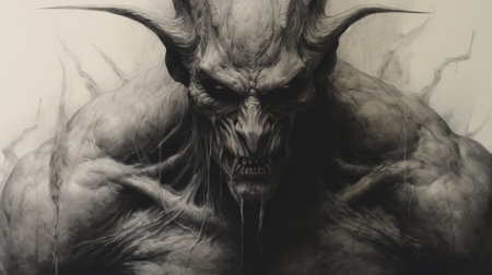 an inked drawing of a horned monster, showcasing intricate details and a captivating atmosphere. the intense lighting and shadow create a sense of depth, while the hyperrealistic painting style adds to its visual impact. with 32k uhd resolution, the image combines elements of ps1 graphics and supernatural realism, resulting in a close-up portrayal that is both captivating and eerie. ai generated