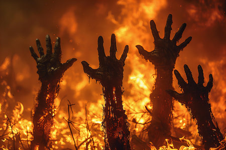 Zombie hands rising from the fire. Horror concept. Halloween.