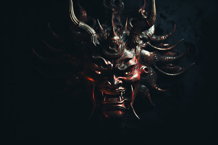 Japanese oni mask or giant mask, used to decorate handmade from original to make it look dark and art, with hand touching on it
