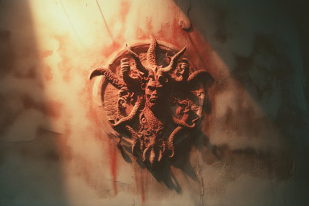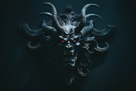 Fantasy horned demon with intricate details surrounded by a mystical atmosphere. Concept of mythology, fantasy character, dark magic, mythical being. Halloween. Halloween.