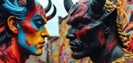 Close-up of the face of a man and a woman painted with red, blue and yellow paints.