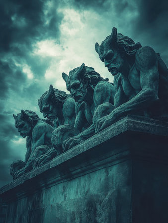 Dark Teal Gothic Demon Statues Dramatic Sky Ancient Evil Sculpture art grim stone devil fiend beast