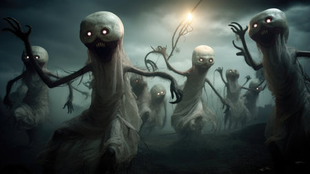 A group of scary ghosts in a cemetery. Halloween holiday concept.