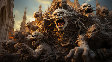 the demons evil head, created by marcin sobas, is a hyper-detailed illustration in the style of unreal engine. the energy-filled illustration depicts a chilling crowd of majestic and burned-charred demon figures, with the evil head taking center stage. the head features menacing horns and a terrifying expression, perfectly capturing the essence of demonic evil. this piece is a must-see for fans of dark and haunting