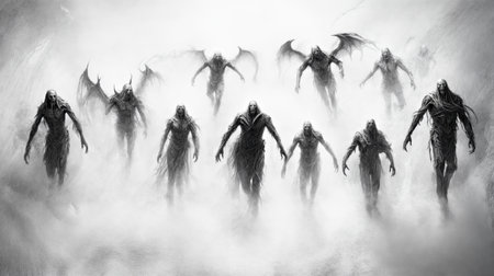 Eerie Phantom Army Emerging from Mist in Monochrome Fantasy Horror Scene..