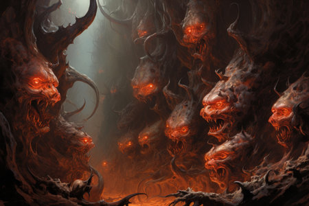 Crowd of scary demons, screaming monsters in the dark. Hell, nightmare fantasy illustration. Generative AI.