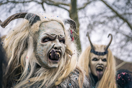 Zug, Switzerland - March 1, 2025: A person in a Tschaggatta, furry beast costume with a horned wooden mask at a Swiss winter carnival Fasnacht parade