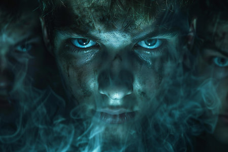 Zombie man with blue eyes. Horror movie. Halloween theme.