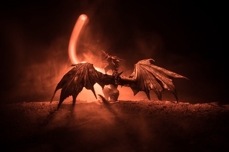 Silhouette of fire breathing dragon with big wings on a dark burning fire background. Selective focus