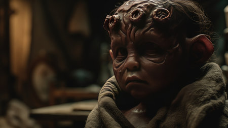 crafts creature in the dark, a film still from a 1980s grindhouse movie. hyper grainy and hyper detailed, this dark scene captures the essence of a gritty panos cosmatos movie about a necronomicon demon warrior. shot with canon eos r3 and a 50mm f/1.8 lens, this hyper realistic photography showcases intricate yet simple craftsmanship. with chromatic aberration, grain, and a glowing effect, this melting claymation
