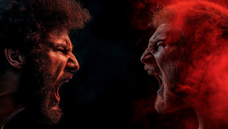 An Intense confrontation between two men with contrasting expressions, one with curly hair and other with beard, both shouting passionately against dark background