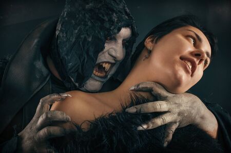 Scary vampire devil biting young woman. Medieval gothic nightmare horror. Studio shoot